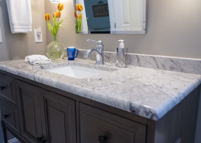 After meeting with TrendMark to discuss the possibilities, we developed a plan to remodel the kitchen, bathrooms, laundry room and add an outdoor living area including a screen porch, deck and large terrace. We also removed the interior wall between the kitchen and family room to create an open concept floor plan that was light and bright. The new gourmet kitchen features custom cabinets, professional appliances, tile stone backsplash and a large island.