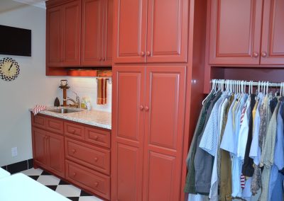 TrendMark also updated the master suite including a double vanity area with a tower linen cabinet, custom tile shower and a new free-standing soaking tub. The new laundry room makes laundry fun with custom painted cabinets and checker board tile floor.